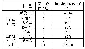 中发生的车辆伤害事故进行了较详细的统计与分析,统计涉及7个工程局,共统计到信息资料较齐全的车辆伤害死亡事故21例,统计结果见表1~表3。