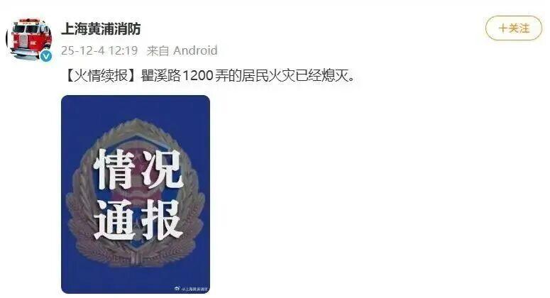 据@上海黄浦消防 11:31官方通报:2025年12月4日10时29分,黄浦区瞿溪路1200弄32号一居民住宅发生火灾。市119指挥中心接警后立即调派消防救援力量到场进行处置,目前火势正在扑救中。