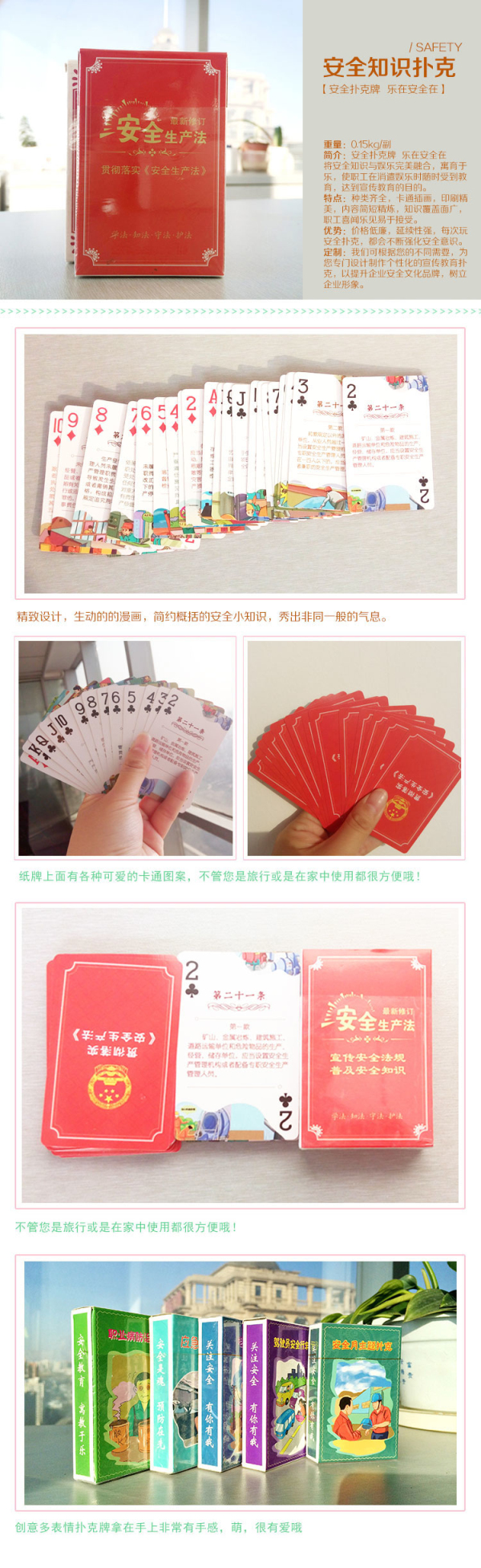 安全扑克牌,乐在安全在。我们推出的安全扑克系列产品,将安全betway必威官方网站 与娱乐完美融合,寓育于乐,使职工在消遣娱乐时随时受到教育,达到宣传教育的目的。内容简短精炼,betway必威官方网站 覆盖面广,通过职工易于、乐于接受的方式进行安全宣传教育,使职工不会产生逆反心理,更容易接受。价格低廉,延续性强,每次玩安全扑克,都会不断强化安全意识。
