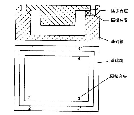 (1)当隔振系统采用阻尼弹簧隔振器,总刚度取1000000N/mm,隔振系统总质量M总=60吨时,隔振效果如表1所示,基础箱与基础块的计权振动加速度VLZdB如表2所示。