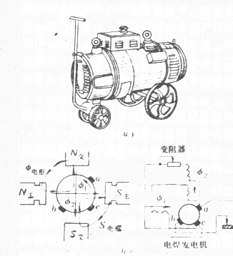 (2) 旋转式直流电弧机 如图3所示,是常用的AX-320型旋转式直流电焊机。它是由一个三相电动机和一个结构特殊的直流发电机组成。由交流电路供电,使电动机拖动发电机电枢旋转发出直流电,供焊接使用。这种直流焊接发电机按其结构特点分为裂极式和差复极式及极间去磁式等形式。它是利用磁通和电枢反应的相互作用,获得下降式的外特性,使电焊电流可在较大范围内均匀调节,以满足焊接工艺的要求。